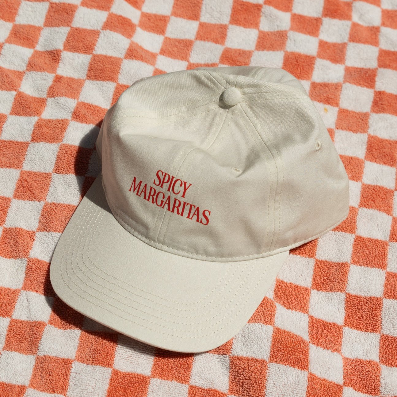 This cap is a white adjustable back cap with a red Spicy Margaritas print on the front, exclusive to Mr. Consistent!